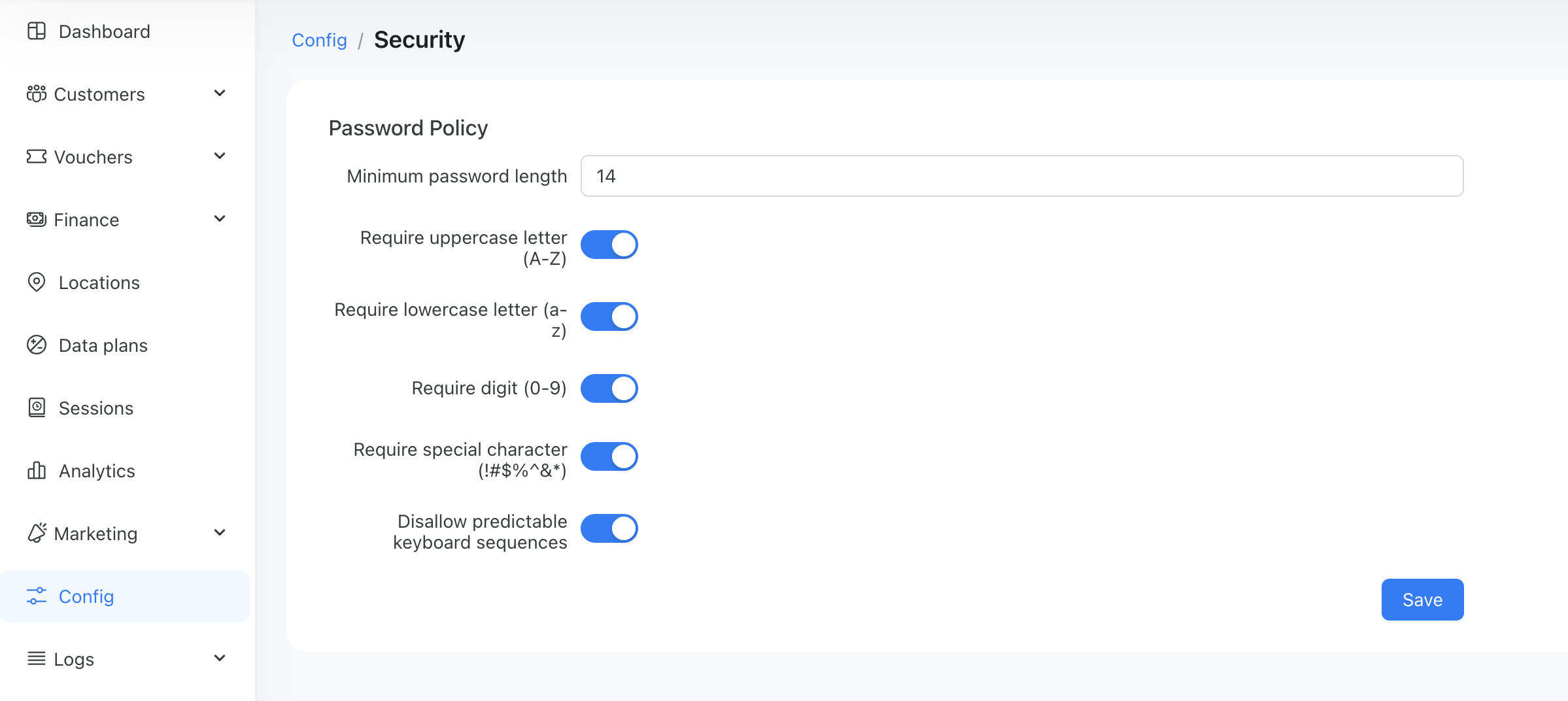 We have introduced a new configuration section under Config → Security, where you can set the admin’s password policy: